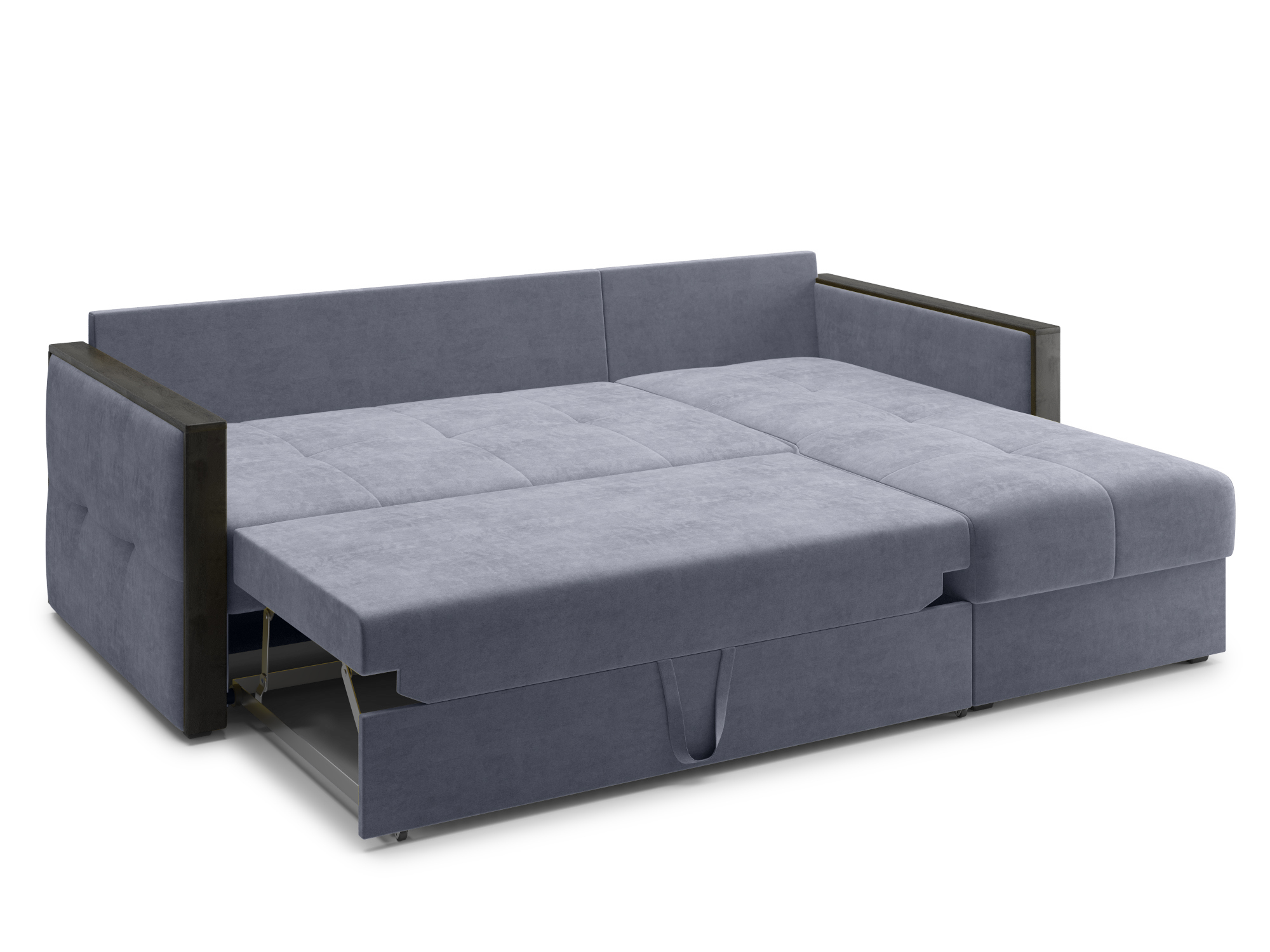 - Механизм раскладки дельфин — основан на выкатывании дополнительной платформы, скрытой под сидением дивана. Чтобы разложить диван, нужно потянуть за специальные ремешки, помогающие перемещать элементы конструкции. В результате этого действия нижняя часть дивана начнёт перемещаться. Делать это нужно до тех пор, пока часть не выдвинется максимально вперед. Затем следует немного приподнять элемент и упереть в противоположную часть, которая осталась неподвижной. Под сиденьем дивана находится короб для хранения вещей и постельных принадлежностей.
