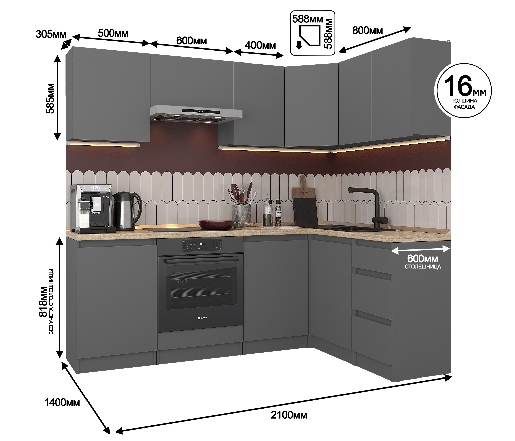 Обратите внимание, что столешница, стеновая панель, мойка и смеситель не входят в комплектацию кухни Леон и приобретаются отдельно. Это позволяет вам выбрать идеальные аксессуары и элементы для создания индивидуального дизайна вашей кухни.