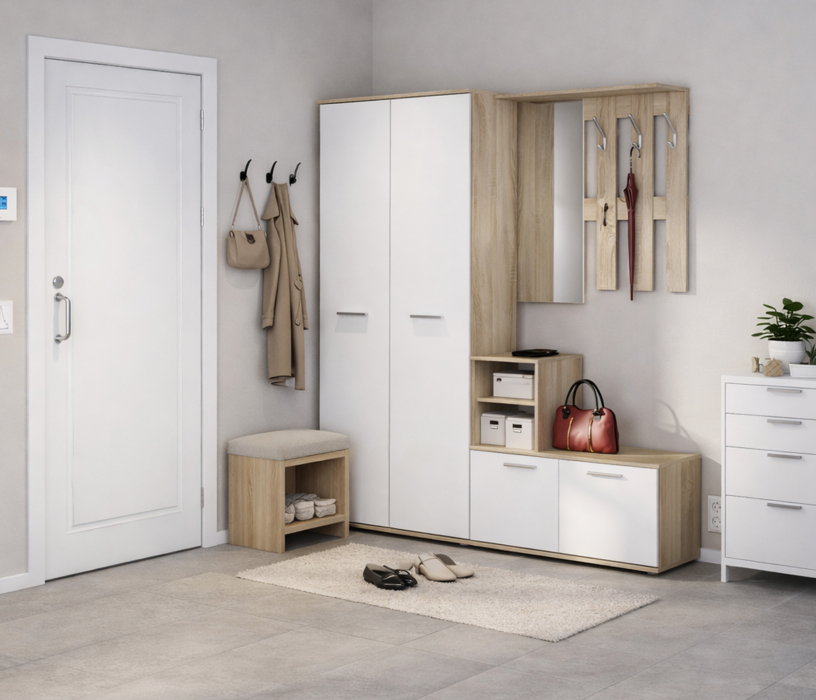 Вместительные шкафчики, удобное отделение для обуви. Выглядит солидно и шикарно. Органично вписывается в небольшую прихожую моей квартиры.
