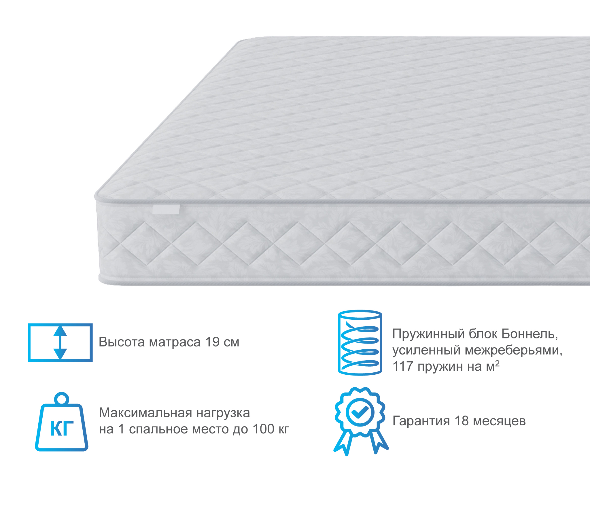 Матрас высокой жесткости с усиленным пружинным блоком Боннель . Усиление достигается за счет вставок из пенополиуретана. Данный матрас рекомендуется для людей с повышенной массой тела.